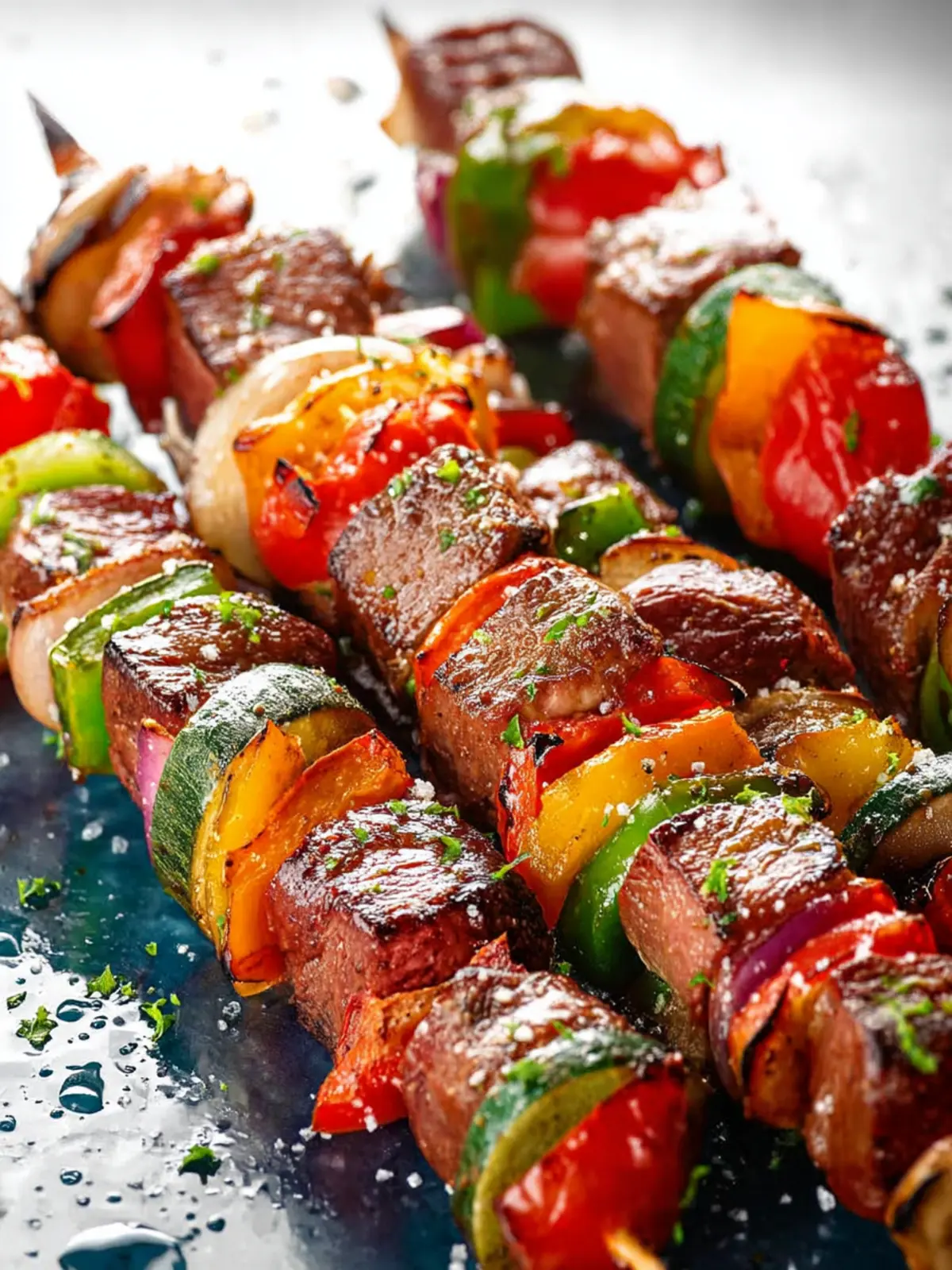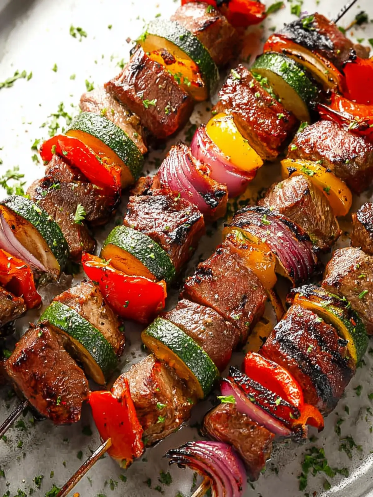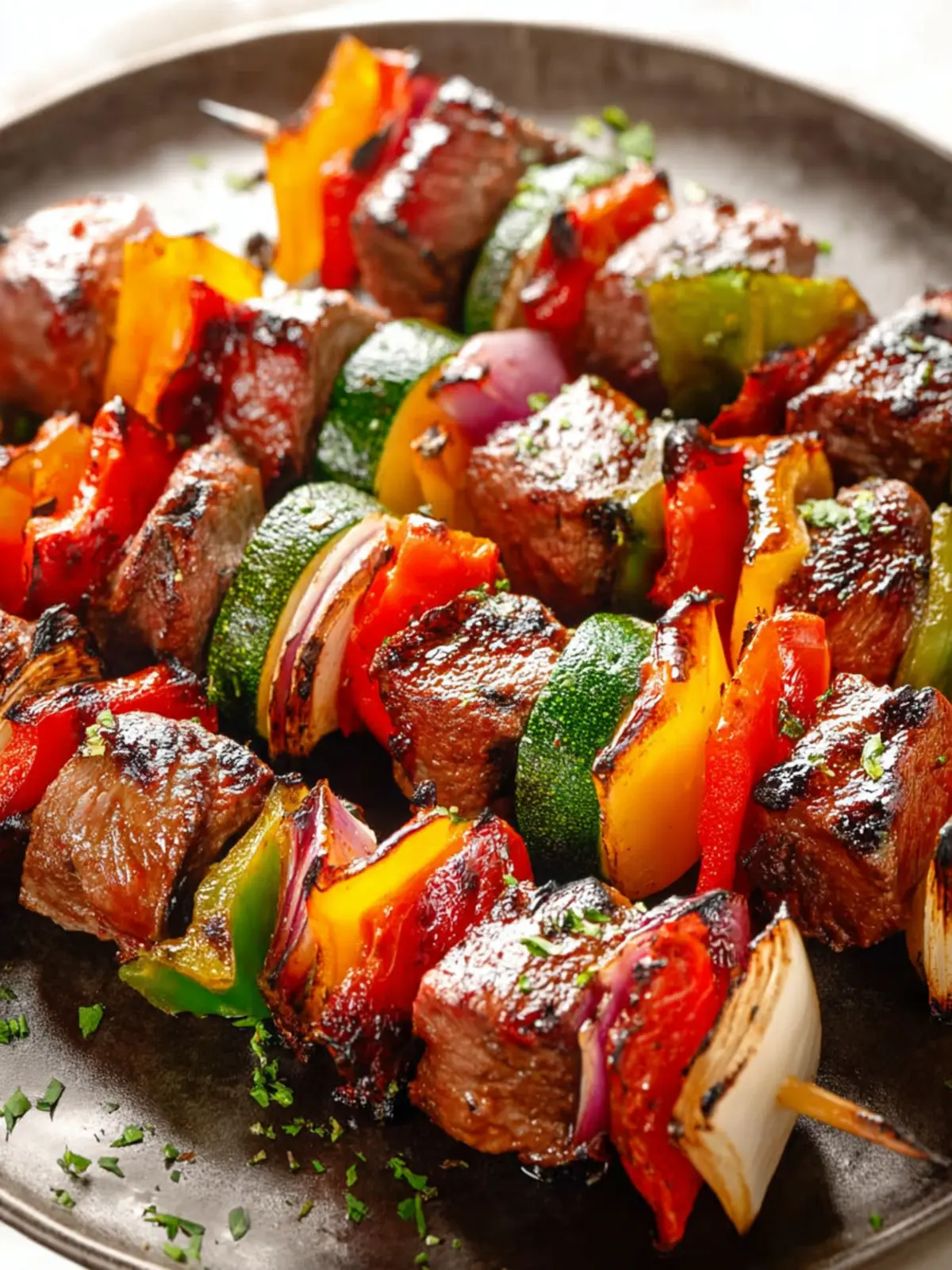 Delicious grilled kabobs made with top sirloin steak and colorful vegetables, marinated in a flavorful sauce.