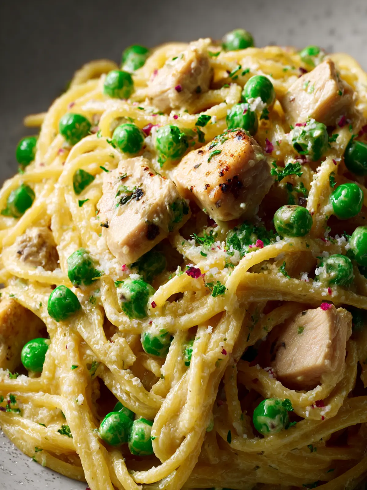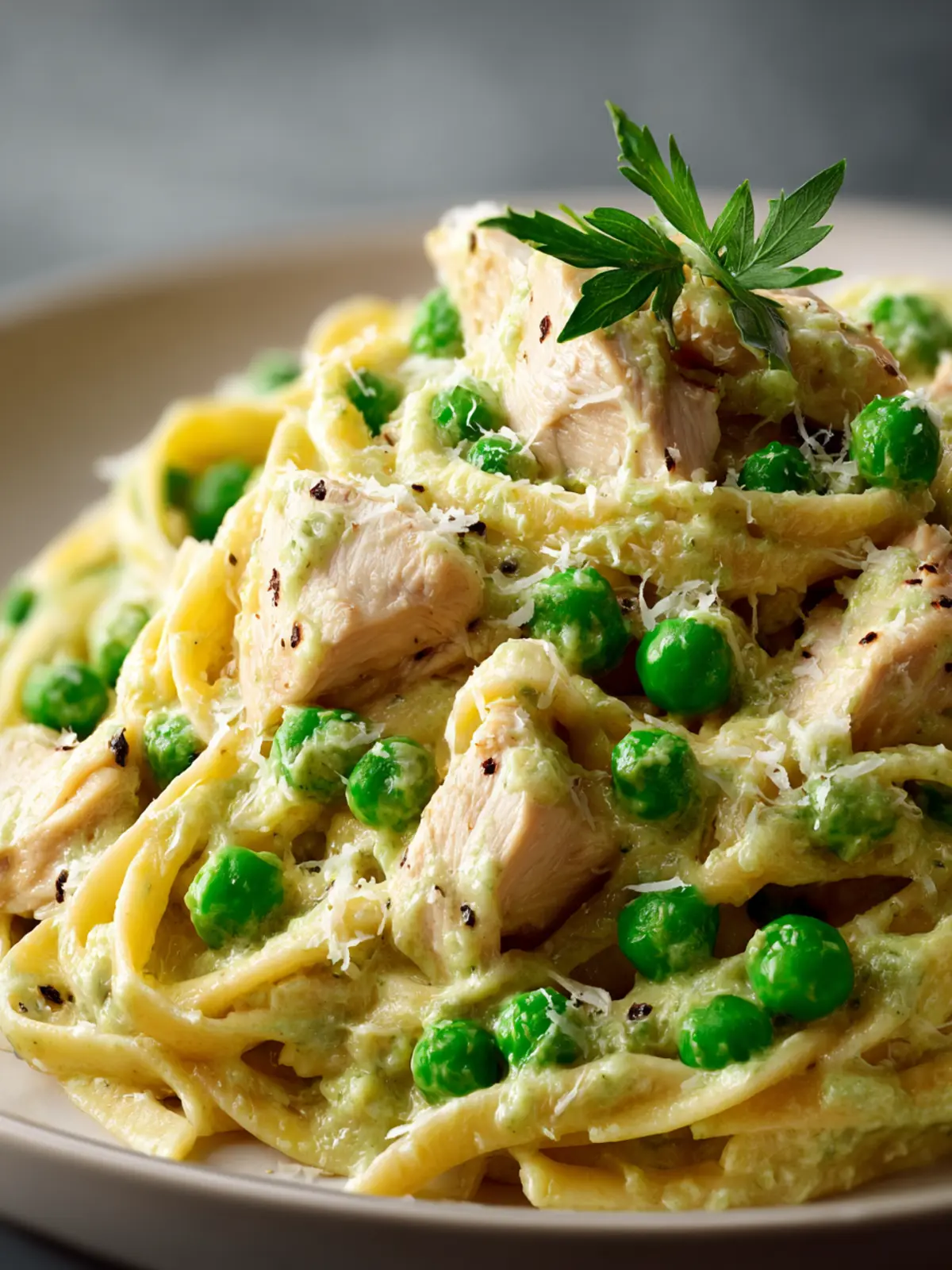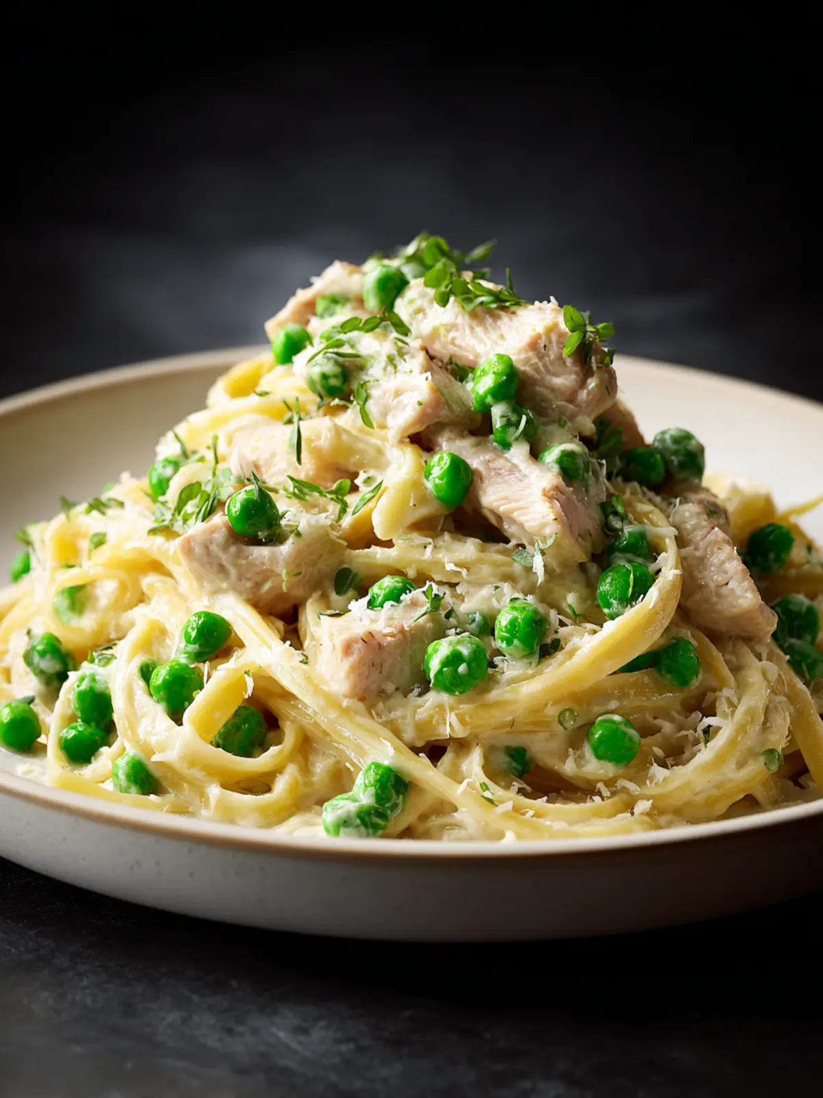 A delicious creamy chicken pasta dish featuring tender chicken, fresh peas, and a rich sauce.