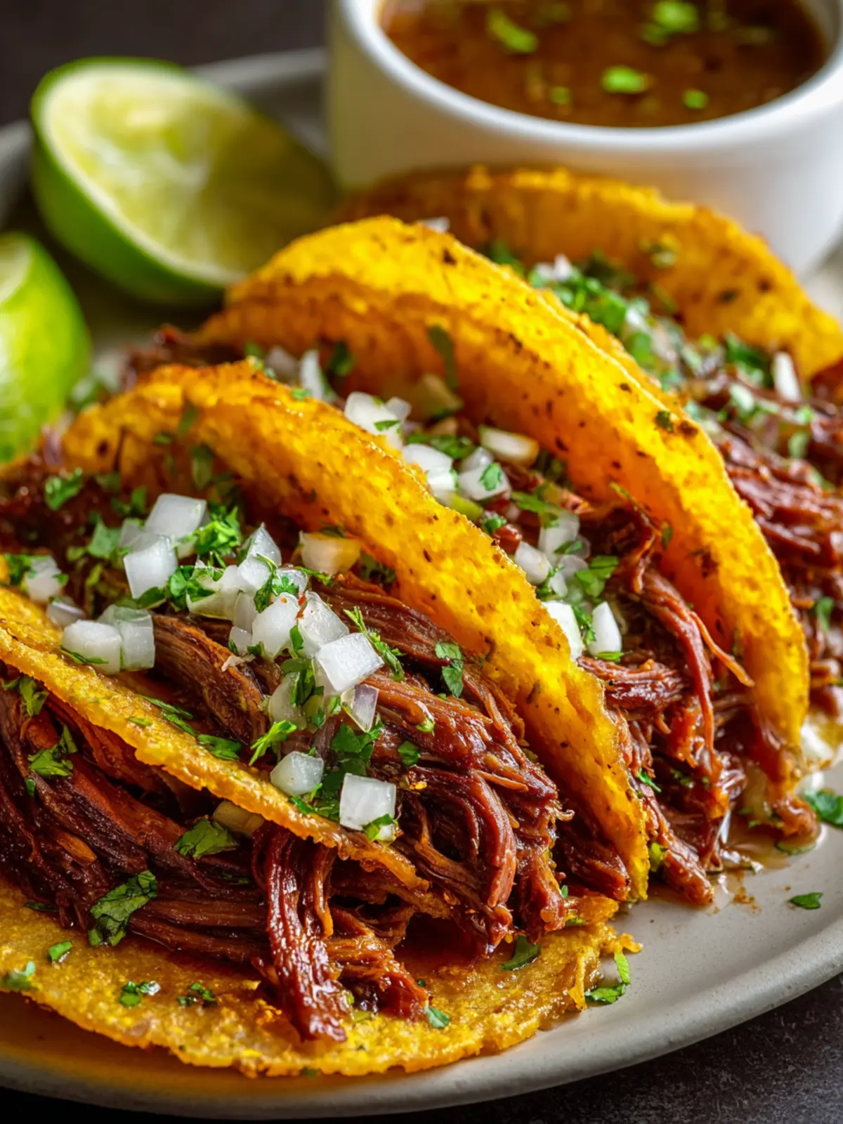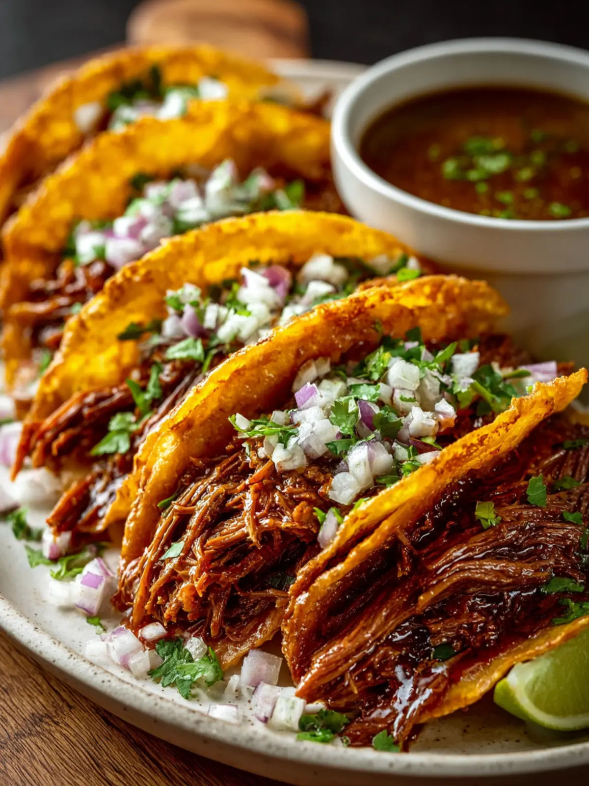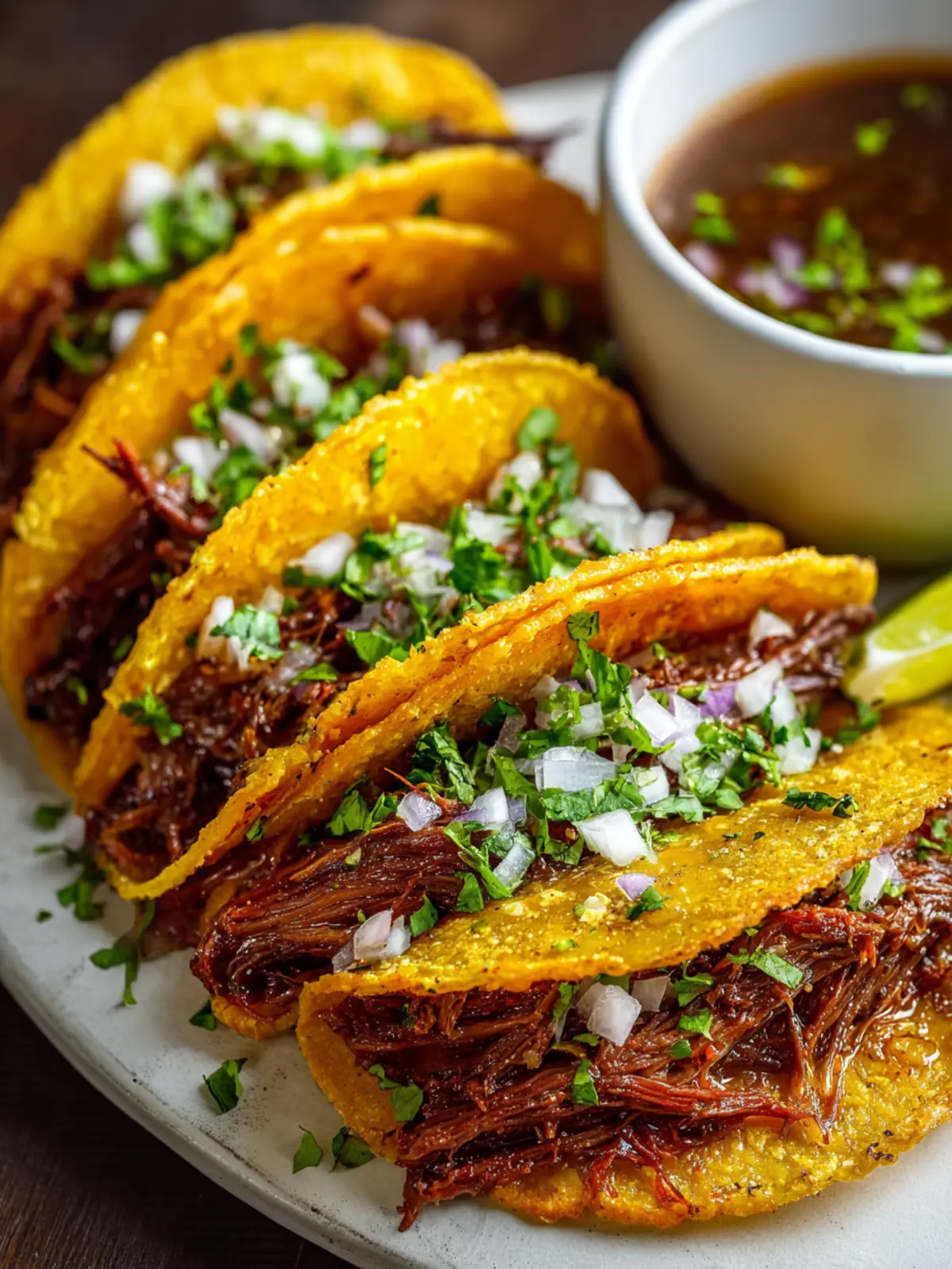 Serve your tacos with a small bowl of the rich broth from the slow-cooked beef. Dip your tacos before each bite for an unforgettable experience. Enjoy every delicious morsel!
