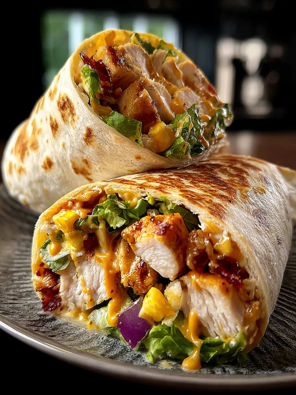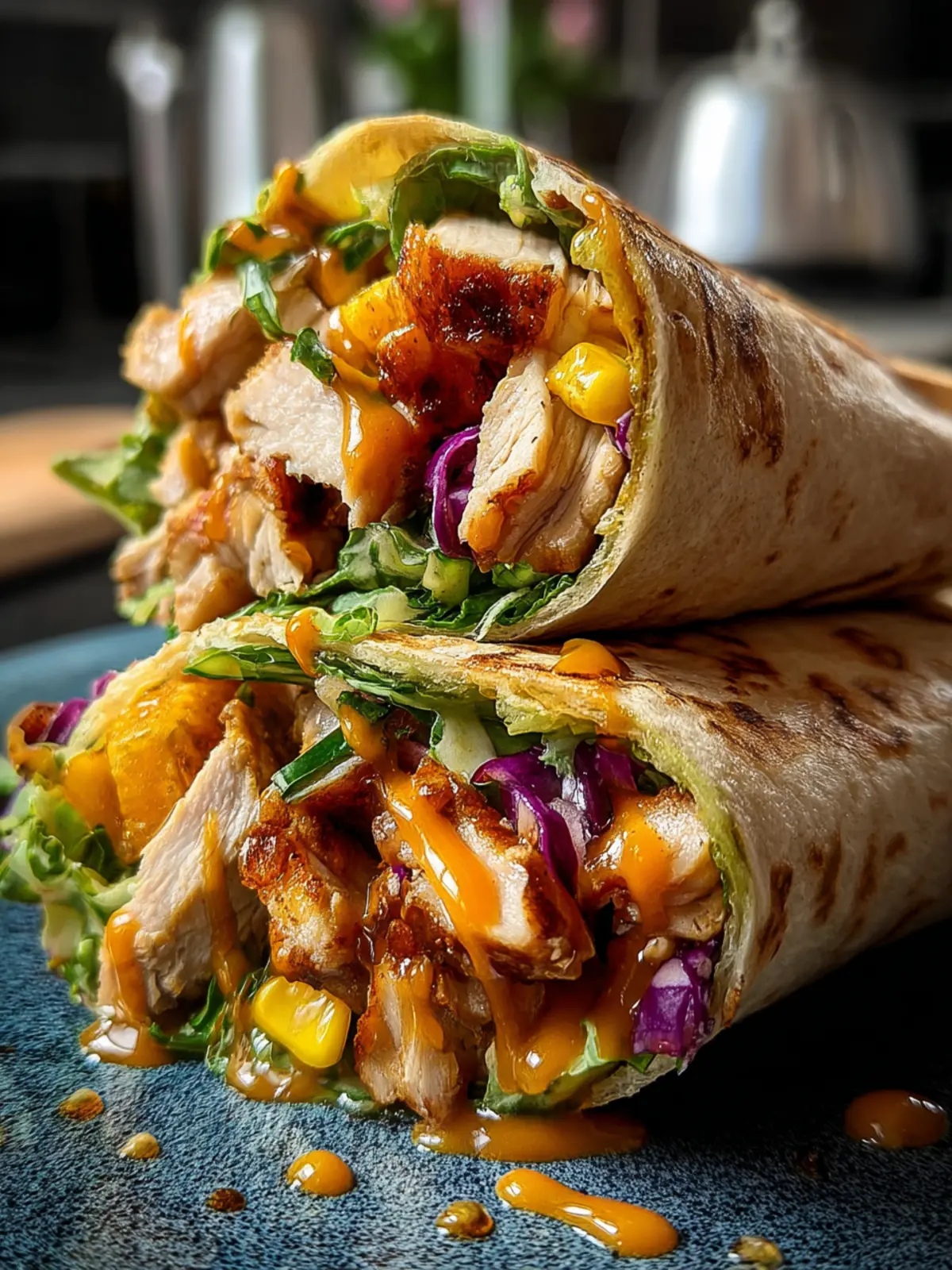 - Lay out tortillas, layer with sliced chicken and fresh vegetables, and drizzle with extra sauce if desired.