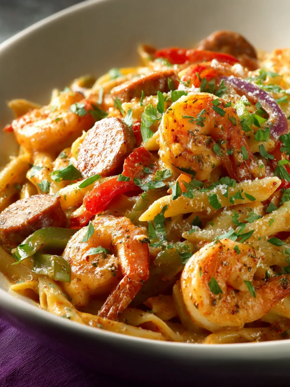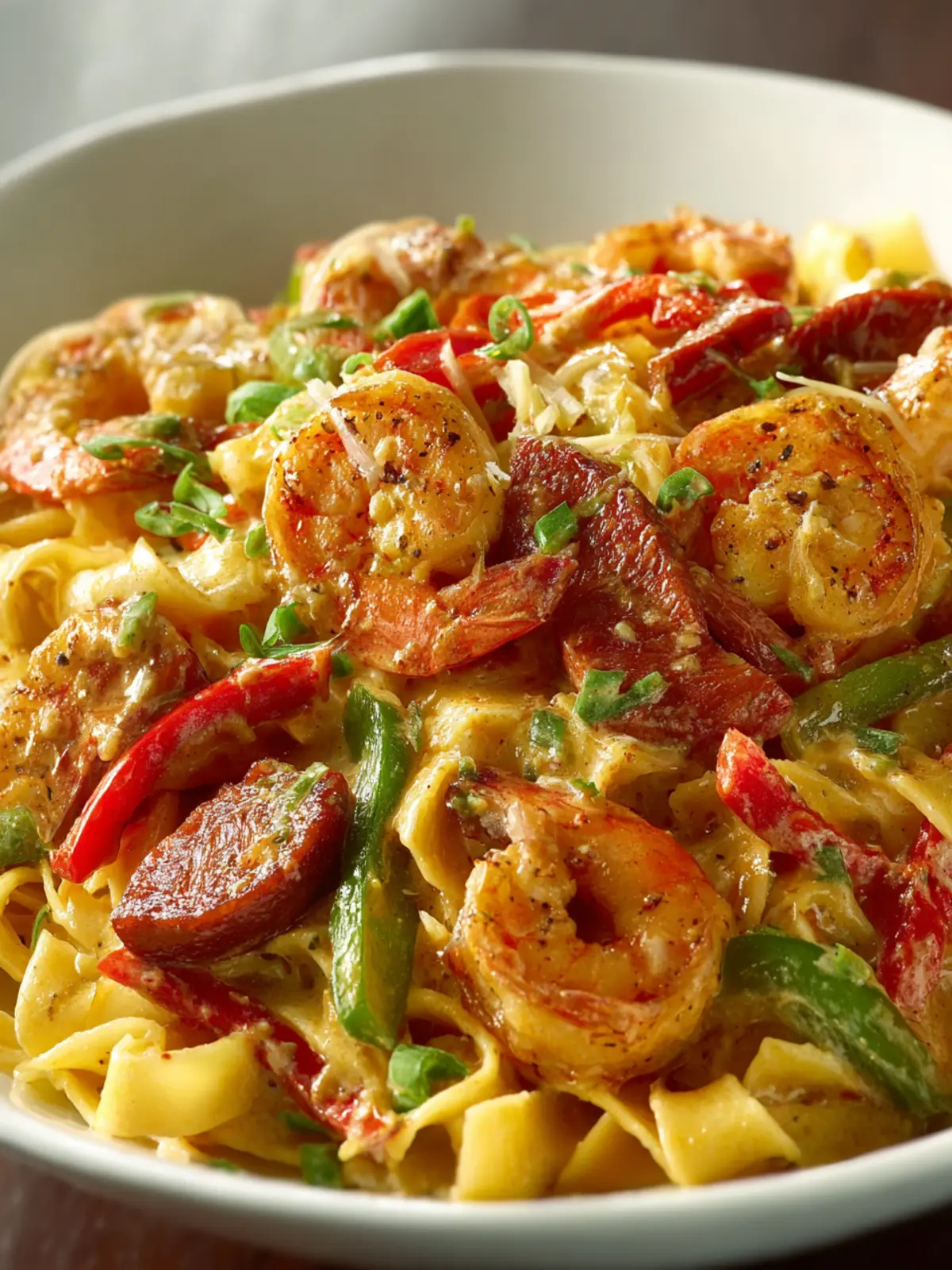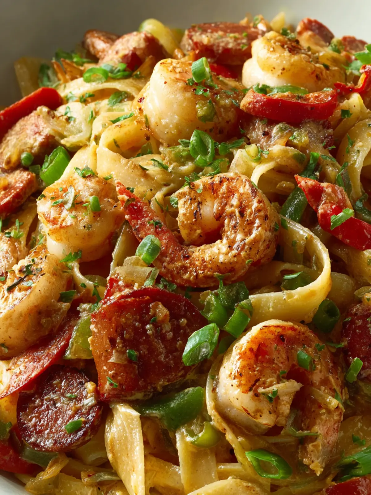 A delicious creamy pasta dish with shrimp, crawfish, and spicy sausage.