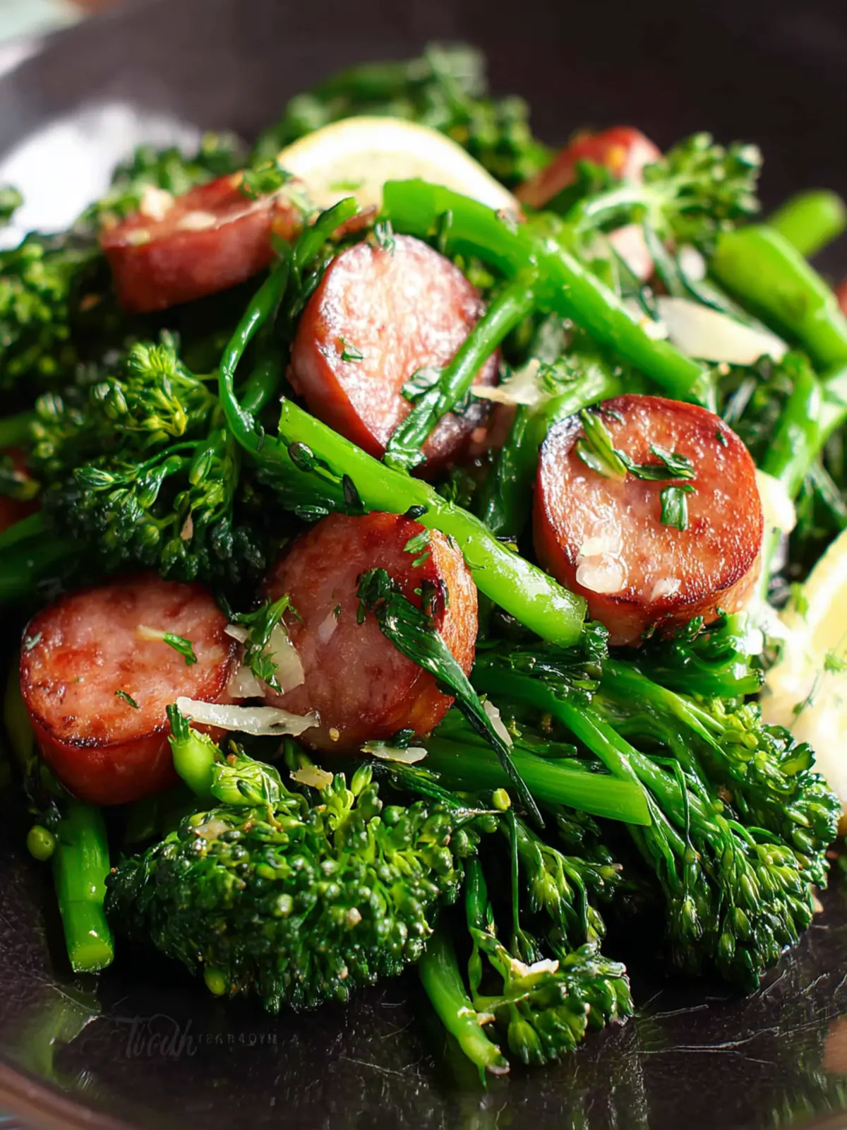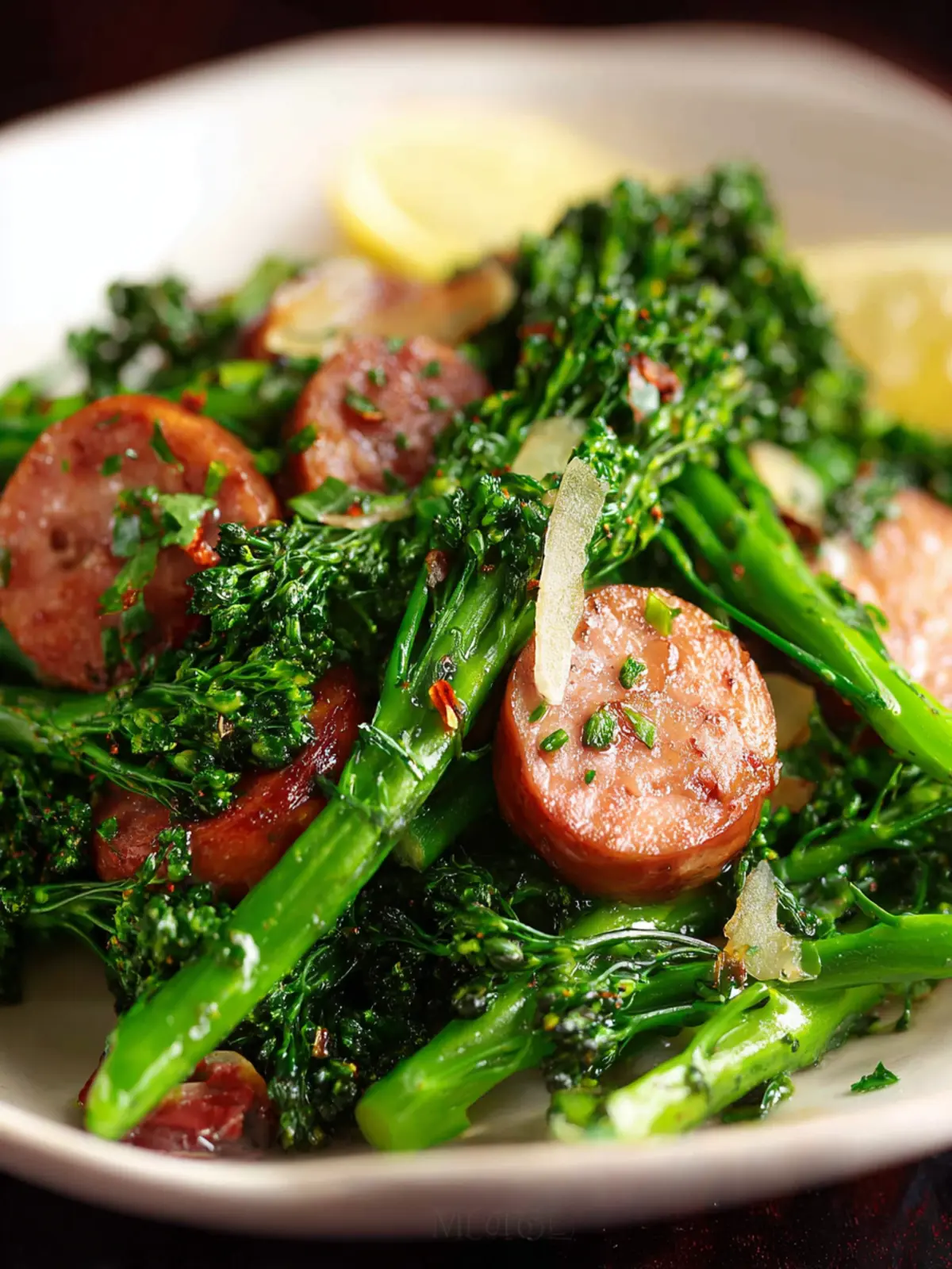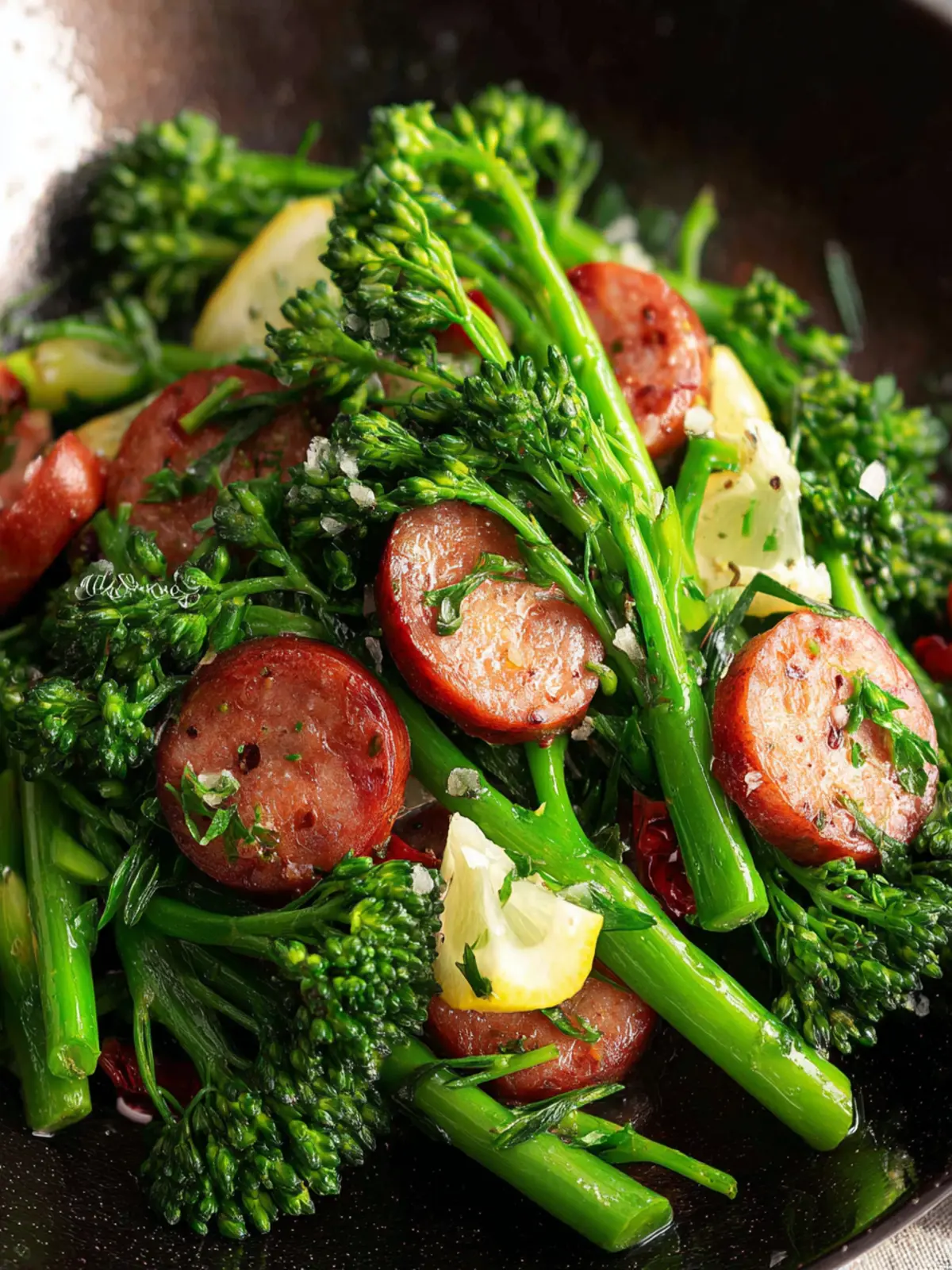 A quick and delicious sautéed broccolini dish with smoked sausage and garlic, perfect as a side or a main course.