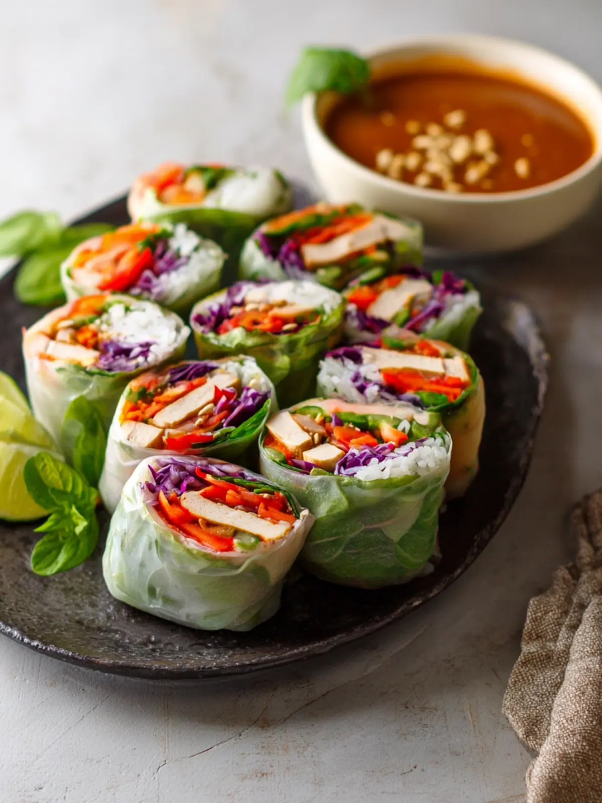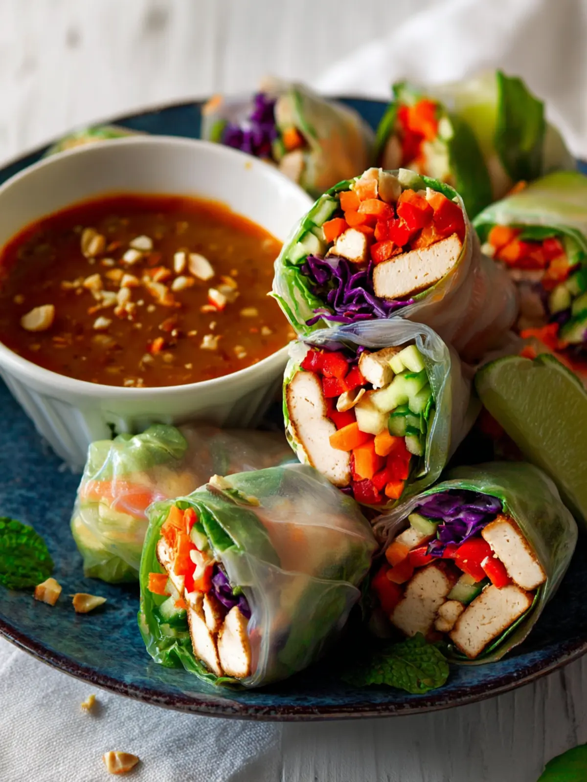 Fresh and healthy tofu spring rolls made with vibrant vegetables and served with a rich peanut sauce.